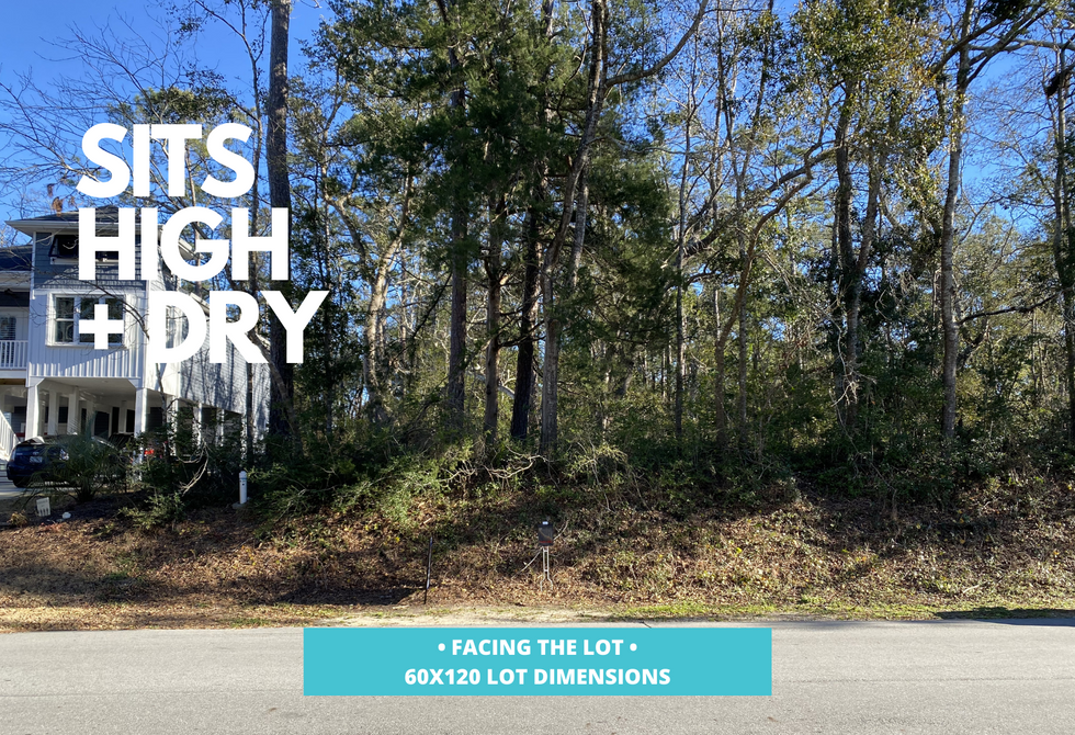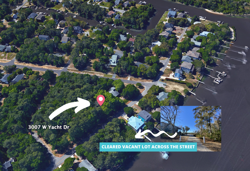 Situated, quite beautifully, high (very high) and dry near the corner of W Oak Island Drive and W Yacht Drive, you’ll enjoy unobstructed views of the Intracoastal Waterway across the street, where the cleared lot directly in front hosts only a dock and a couple of Adirondack chairs.